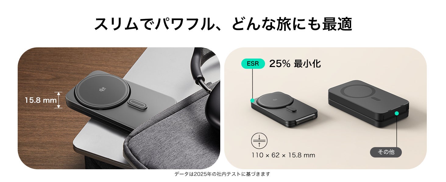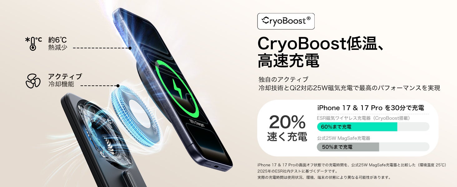 2025年11月19日より、ESR公式サイトおよびAmazonにて販売が開始されるこの新製品は、最新ワイヤレス規格「Qi2 25W」に対応しています。また、ESR独自のエアフロー冷却ファン「CryoBoost(R)」が、充電中の温度上昇を抑え、Apple公式の有線充電と同等の速度で充電を可能にしています。