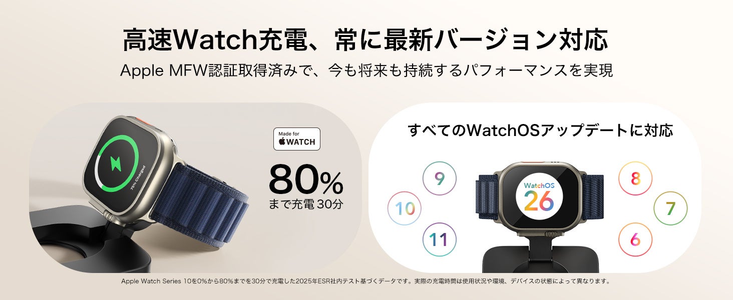 Qi2.2対応25W高速ワイヤレス充電+MFW認証: Apple Watch 10シリーズもケーブル充電に匹敵するスピードで充電可能に。約30分で80%充電がコードフリーのワイヤレスで可能になりました。