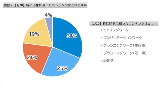 実践的なワークが上位を独占し、特に「ヒアリング」が最も印象に残ったという結果は、逆順設計の効果を示しています。