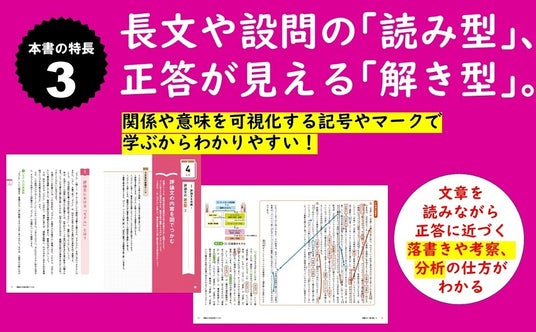 読書量や語彙力といった「国語のセンス」に頼らず、長文や設問の読み解き方である【読み型】、設問を解くための具体的な手順やコツからなる【解き型】の2つの型で、確実に得点アップできるようになります。