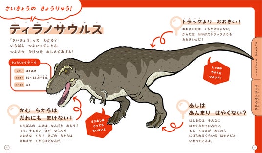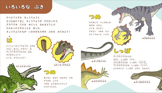 「最強の恐竜・ティラノサウルスの強さの秘訣は?」「ディプロドクスはどうして首が長いの?」「恐竜は子育てしていたの?」など、子どもの素朴な疑問について、やさしい言葉で解説し、「なぜなぜ期」の子どもにきちんと答えられる図鑑を目指しました。