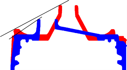 キャップ出し口を横から見た断面図 軽量化キャップ(青色)は、現在のキャップ(赤色)より 出し口は低いものの先端から淵までの角度が深く、垂れにくい設計