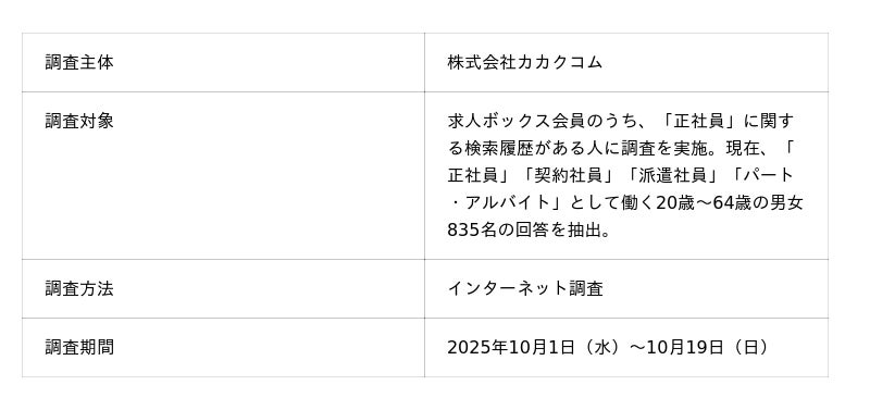 株式会社カカクコム(本社:東京都渋谷区 代表取締役社長:村上 敦浩)が運営する求人情報の一括検索サービス「求人ボックス(https://求人ボックス.com/)」は、2025年11月19日(水)、求人ボックスの利用者を対象(※1)に行った「仕事と暮らしの実態調査」の結果を発表しました。