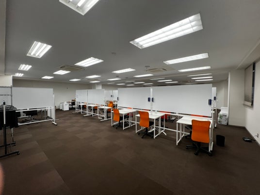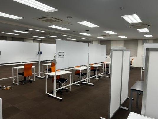 一人ひとりの学習スペースには大きなホワイトボードを完備。複雑な問題の思考過程を図解したり、目の前で要点を書き出しながら解説をするなど「勉強に集中できる」プロセスを可視化することで、より深く、効率的な学習を促します。個別ブースではないので、周りの生徒の頑張りを肌で感じつつも、集中して自分の勉強に取り組める環境となっています。