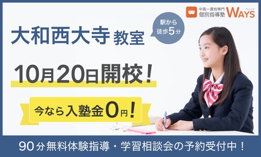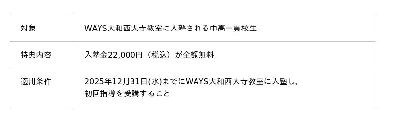 WAYSの大和西大寺教室開校を記念した「入塾金無料キャンペーン」を、ご好評につき引き続き実施しております。期間内のご入塾で、通常22,000円の入塾金が無料となる大変お得な機会です。12月31日(水)までの期間限定ですので、この機会にぜひ無料学習相談へお越しください。