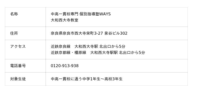 上記、奈良県の中高一貫校生および保護者様は、ぜひこの機会に中高一貫校専門 個別指導塾WAYS 大和西大寺への通塾をご検討ください。