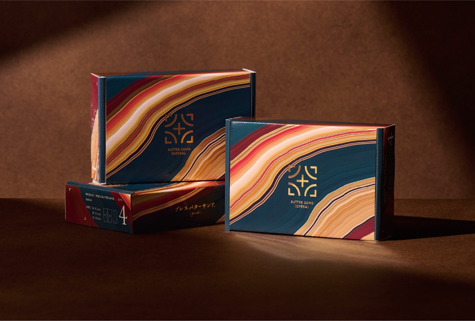 第1弾として発表する「バターサンド〈オペラ〉」は、フランスの伝統菓子“オペラ”から着想を得た、高級感あふれる新作。サクサクのバタークッキーの片側をチョコレートでコーティングし、特別な日にふさわしい贅沢感あふれるバターサンドに仕上げました。