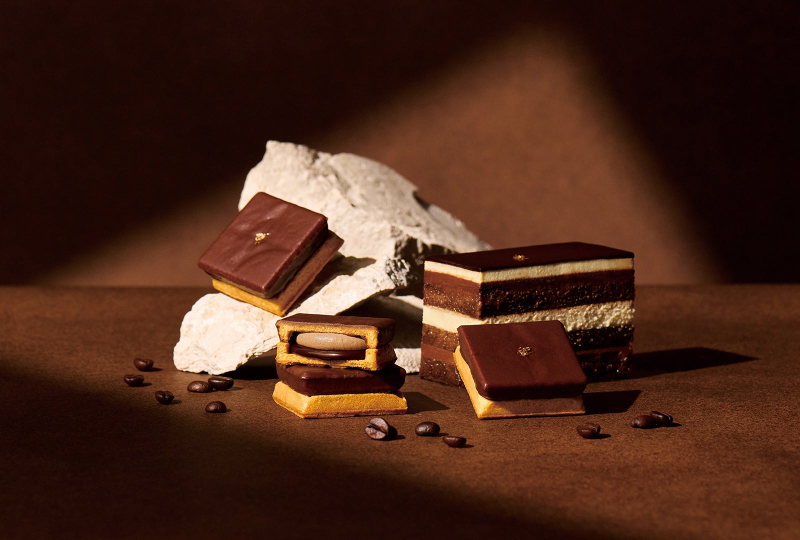 香ばしく焼き上げたアーモンドの香り豊かなクッキーで、芳醇なコーヒーバタークリームとまろやかなチョコレートキャラメルをサンド。上段のクッキーには深みのあるチョコレートをコーティングし、金箔をあしらって上品な装いに仕上げました。