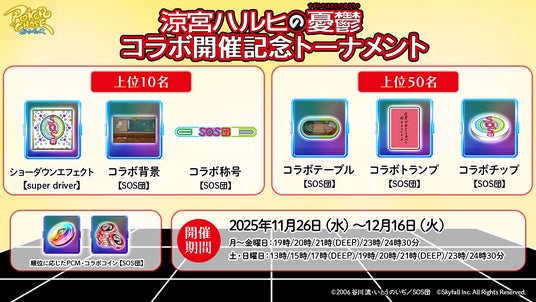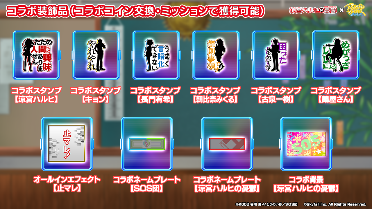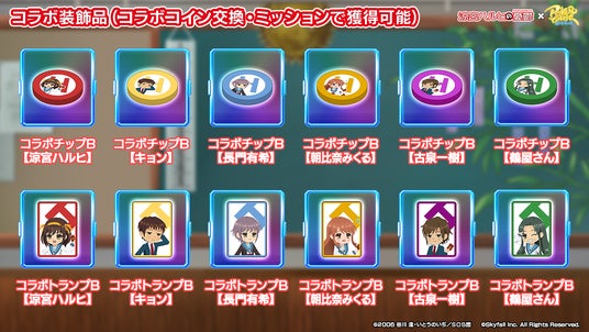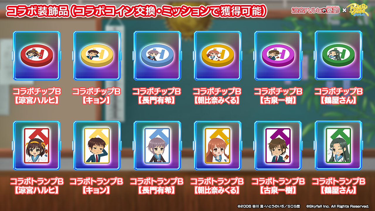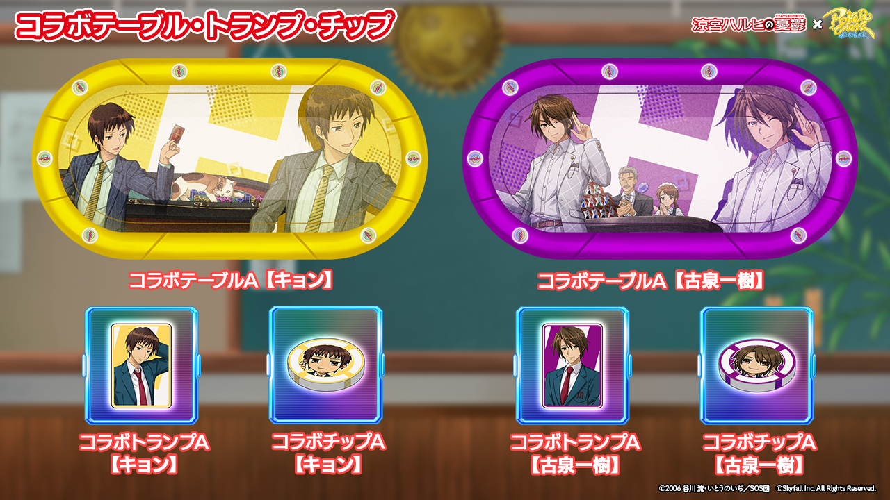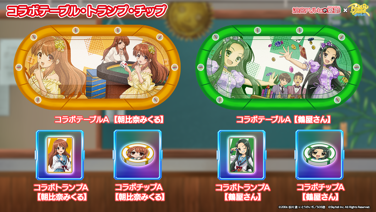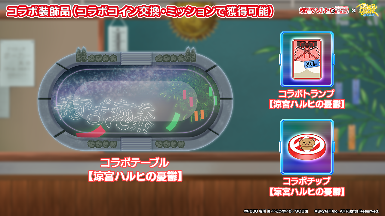 - 上位50名:コラボ背景【SOS団】、コラボテーブル【SOS団】、コラボトランプ【SOS団】、コラボチップ【SOS団】