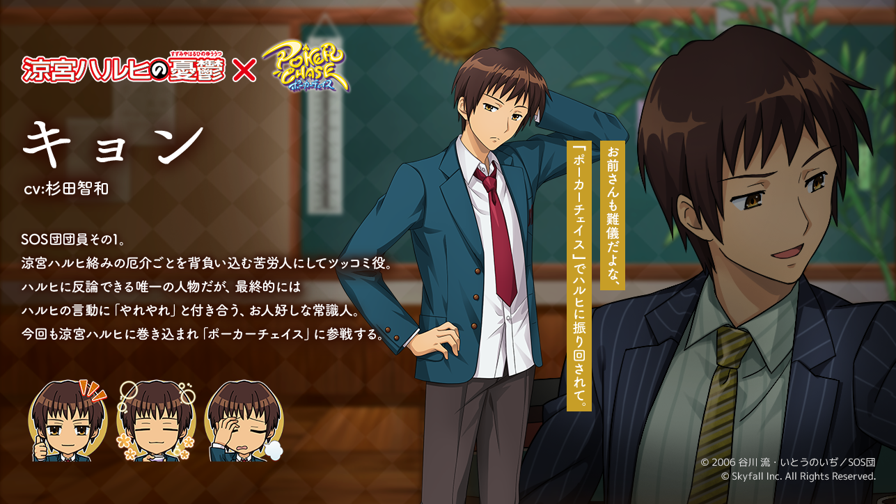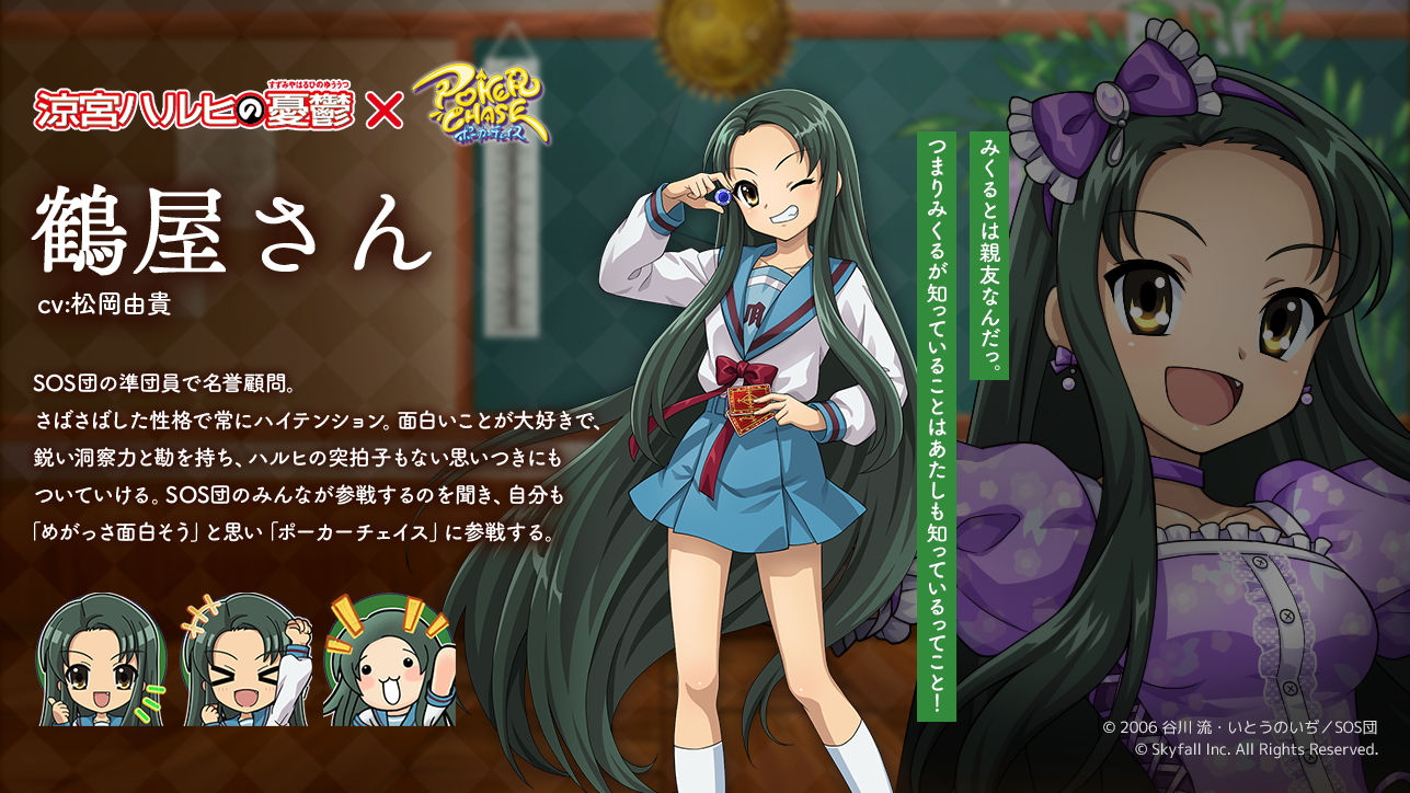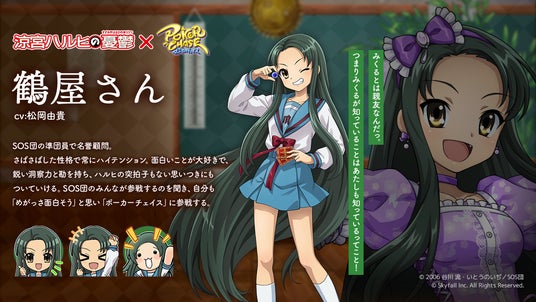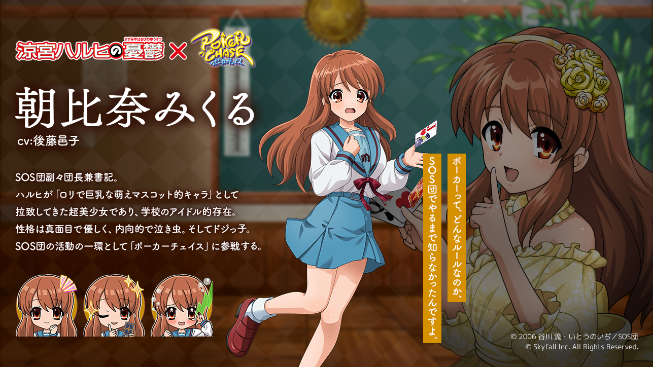 人気キャラクター「涼宮ハルヒ」「キョン」「長門有希」「朝比奈みくる」「古泉一樹」「鶴屋さん」が『ポーカーチェイス』に登場!