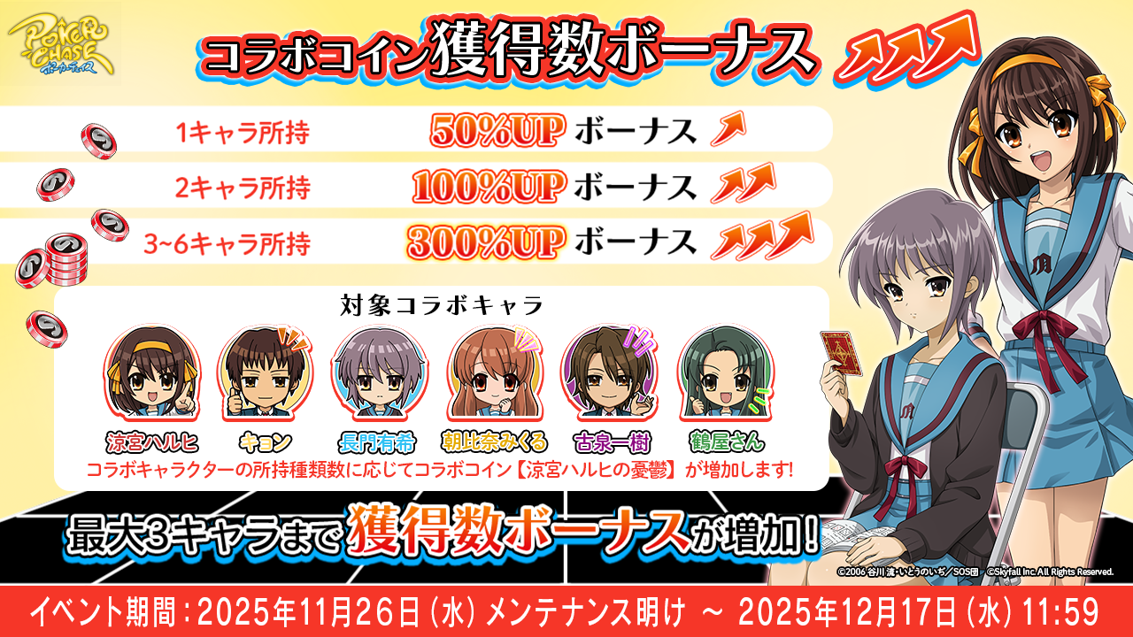 株式会社Skyfall(東京都港区 代表取締役社長:長谷川 智一、以下Skyfall)が運営するバトロワ式オンラインポーカーゲーム『ポーカーチェイス』は、TVアニメ「涼宮ハルヒの憂鬱」と、2025年11月26日(水)~ 12月17日(水)の期間限定でコラボイベントを初めて開催することが決定しました。