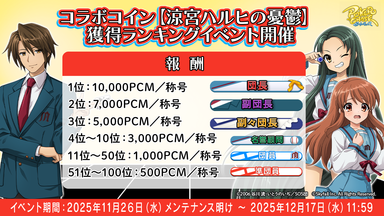 コラボ開催期間中に「コラボコイン【涼宮ハルヒの憂鬱】」の総獲得枚数を競う、獲得ランキングイベントを開催します。PCMに加えて、順位に応じてイベント限定称号を入手できます。