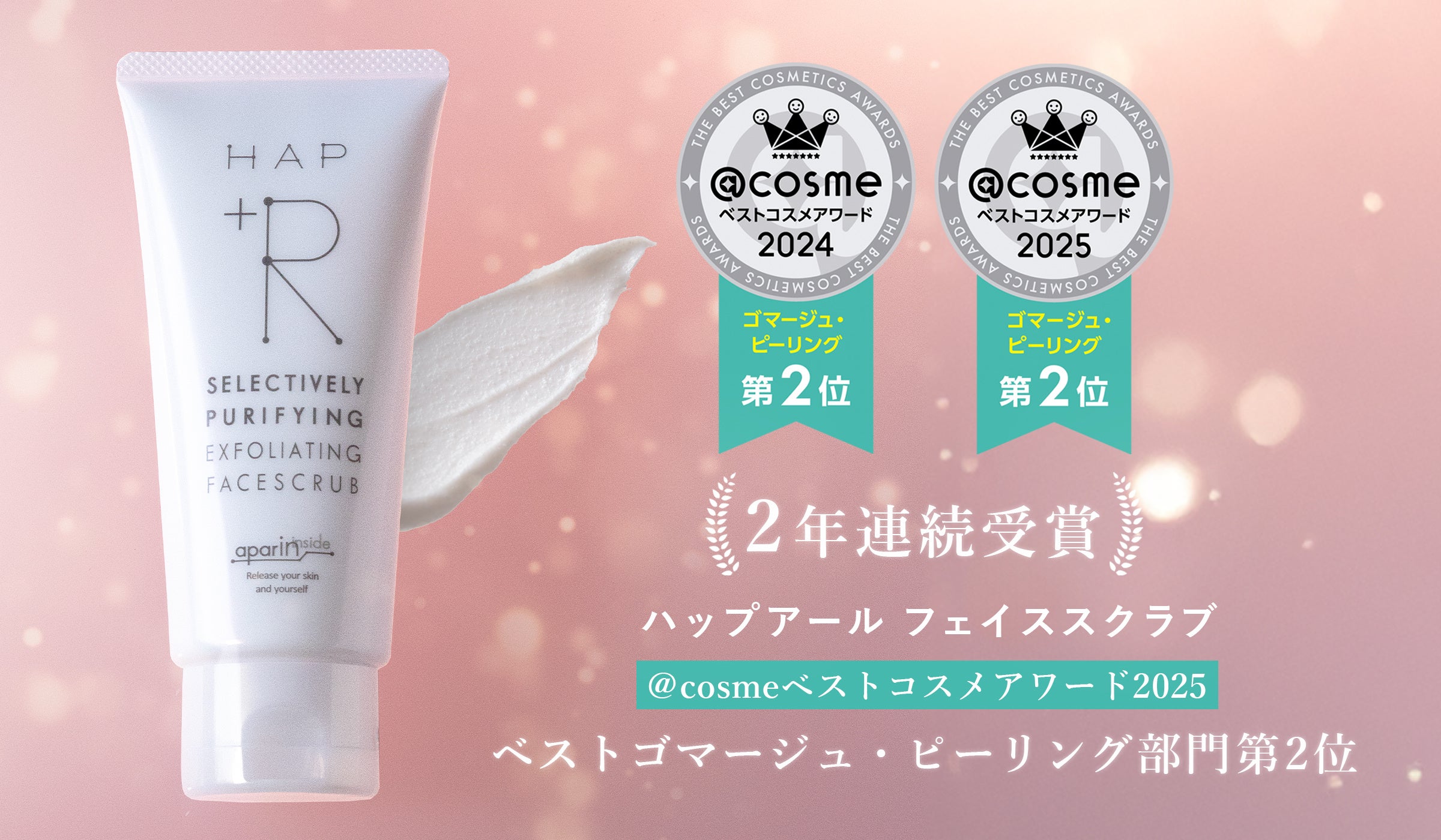 美白高機能歯みがき剤*1 「アパガード」の開発・発売元である株式会社サンギによるスキンケアブランド「HAP+R(ハップアール)」の「フェイススクラブ」が、日本最大級のコスメ・化粧品・美容の総合情報サイト@cosme (アットコスメ)が開催する「 @cosmeベストコスメアワード2025」にて、ベストゴマージュ・ピーリング 第2位を受賞いたしました。2024年に続き、2年連続の受賞となります。