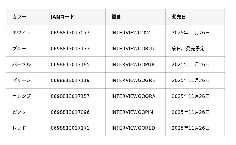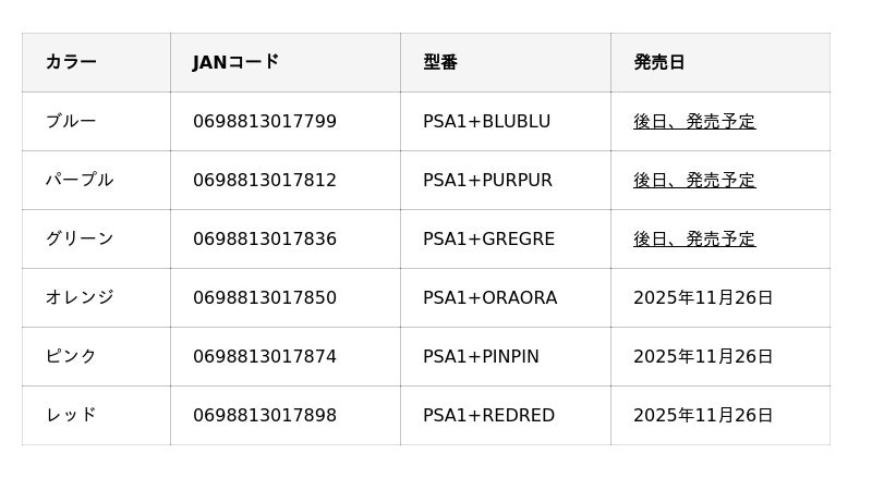 ※「ブルー」「パープル」「グリーン」は、後日、国内発売予定です。