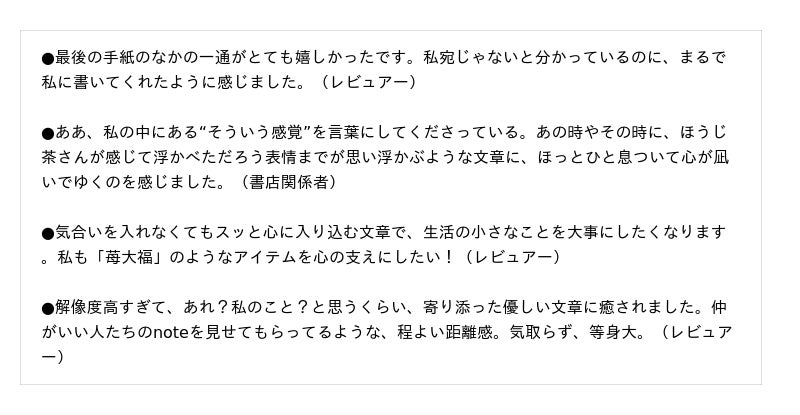 試し読みサイト「Net Galley」にて試し読みしていただいたかたからの感想が届いています。ほうじ茶さんの温かい文章に、多くの共感の声が集まっています。ありがとうございます。(以下、一部抜粋)