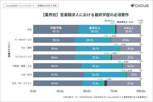 営業職求人全体において、学歴不問の求人が約42.2%を占め 、高卒以上まで含めると約7割の求人で応募が可能という結果になりました。