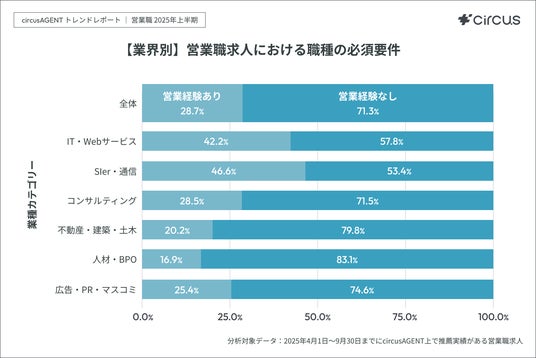 IT・Webサービス(営業経験あり:42.2%)、Sler・通信(営業経験あり:46.6%)業界は、他業界と比較して経験者向けの求人割合がやや高い結果でした。これは、技術商材を扱うため、業界知識や専門的な営業スキルを即戦力として必要とする企業の採用戦略が反映されていると推察されます。
