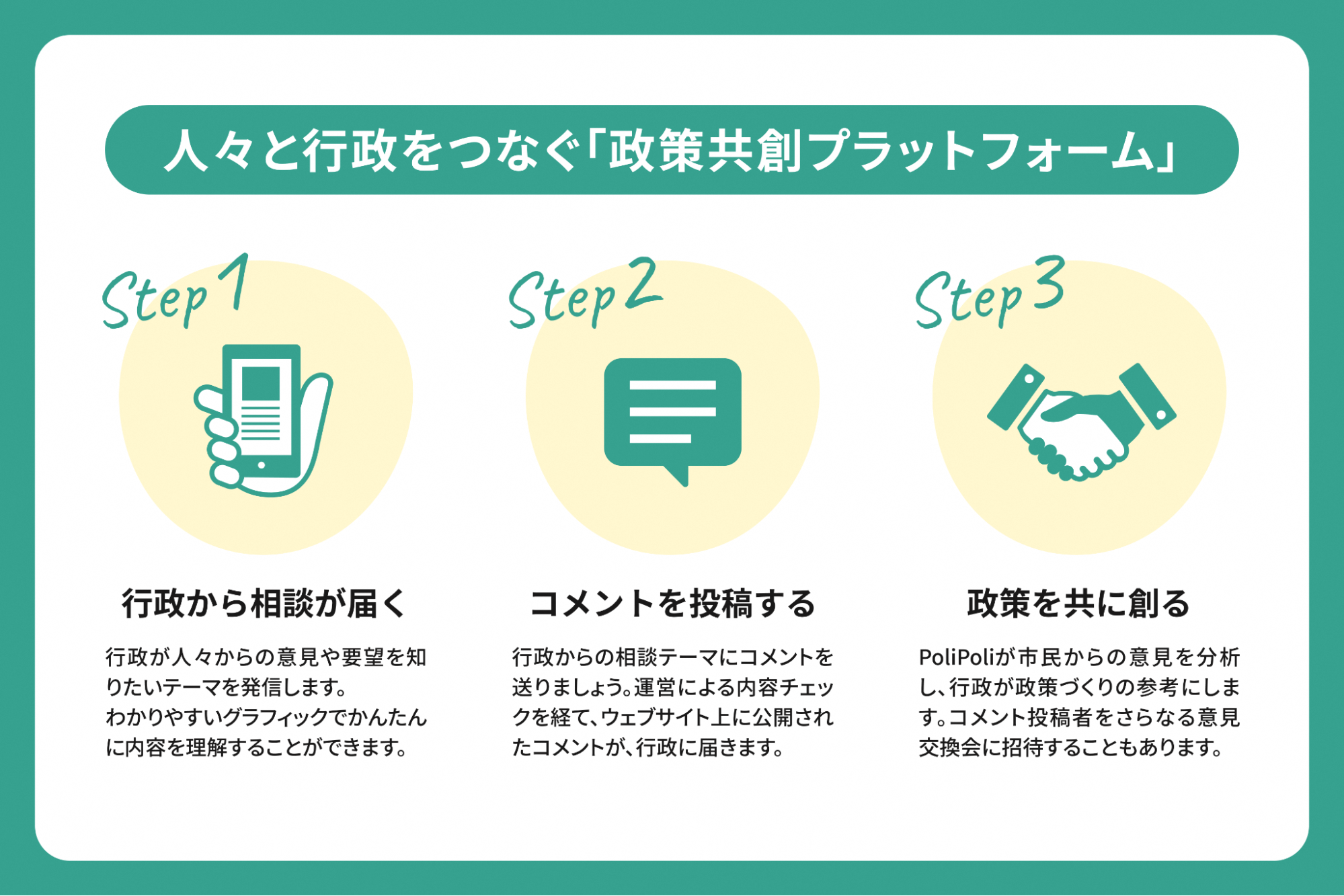 市民と行政が共に社会を創るための「政策共創プラットフォーム」です。誰もがオンラインで気軽に、アイデアを行政に届けることができます。国民や住民の行政に対する意見や要望を聴く活動(=広聴)をデジタル時代に対応した新たな仕組みへアップデートし、一人ひとりの幸せな暮らしに貢献します。<サービスの仕組み>