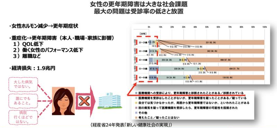 更年期障害の確定診断は確率されておらず、未受診や未治療につながっています。こうした背景から経済産業省の試算によりますと更年期障害による経済損失は年間1.9兆円とされ、大きな社会問題となっています。