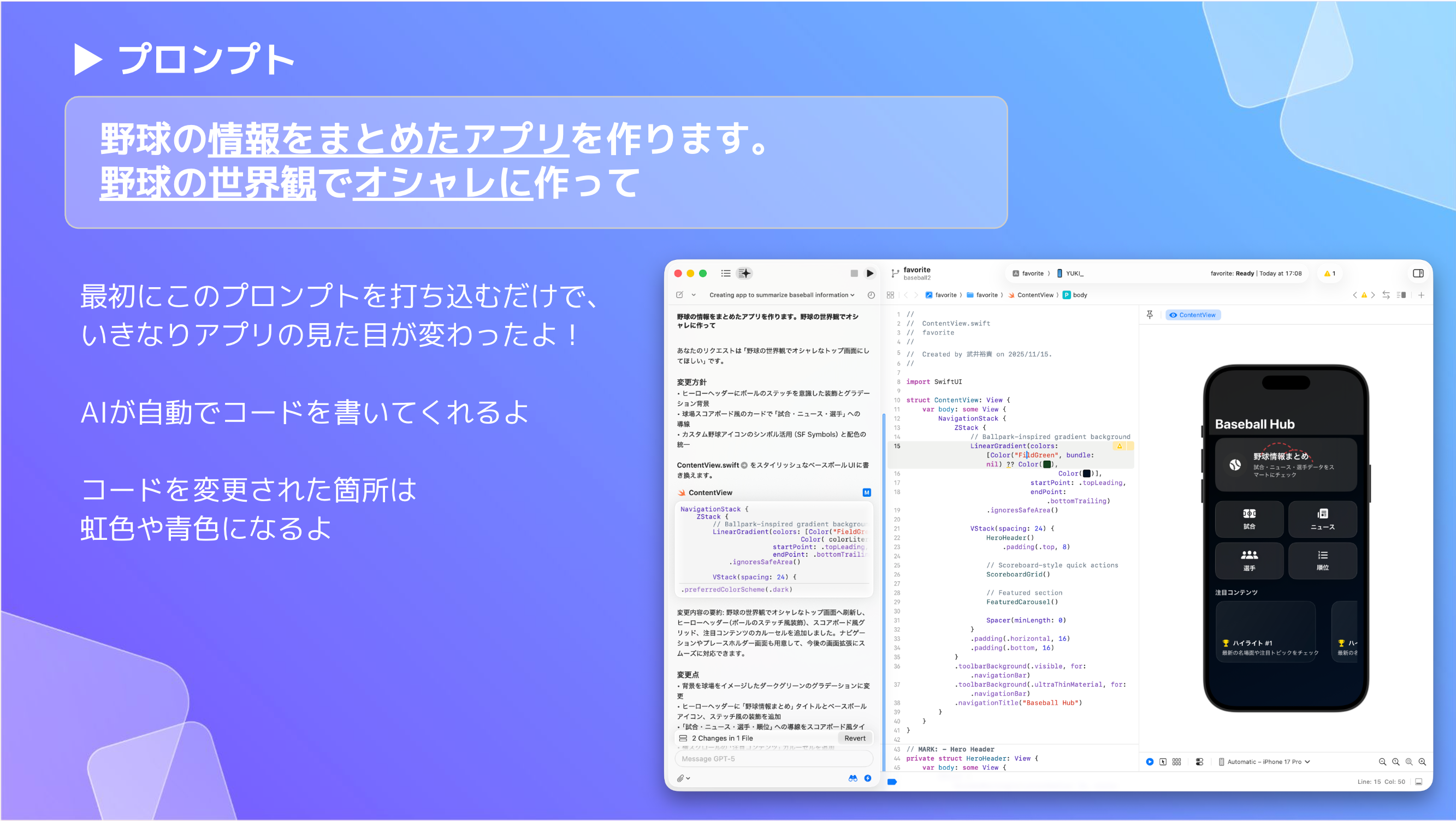 バイブコーディングとは、AIと対話しながら自然な言葉(Vibes)でアプリ開発を行う新しい開発スタイルです。本カリキュラムでは、Appleの最新開発ツール Xcode 26 に搭載される「Coding Intelligence」(大規模言語モデルと連携し、自然言語でコード生成・補助が可能な機能)を活用し、アプリを創ることで、創造性・発想力だけでなく基礎理解も同時に育てる「AI時代の学び」を提供します。