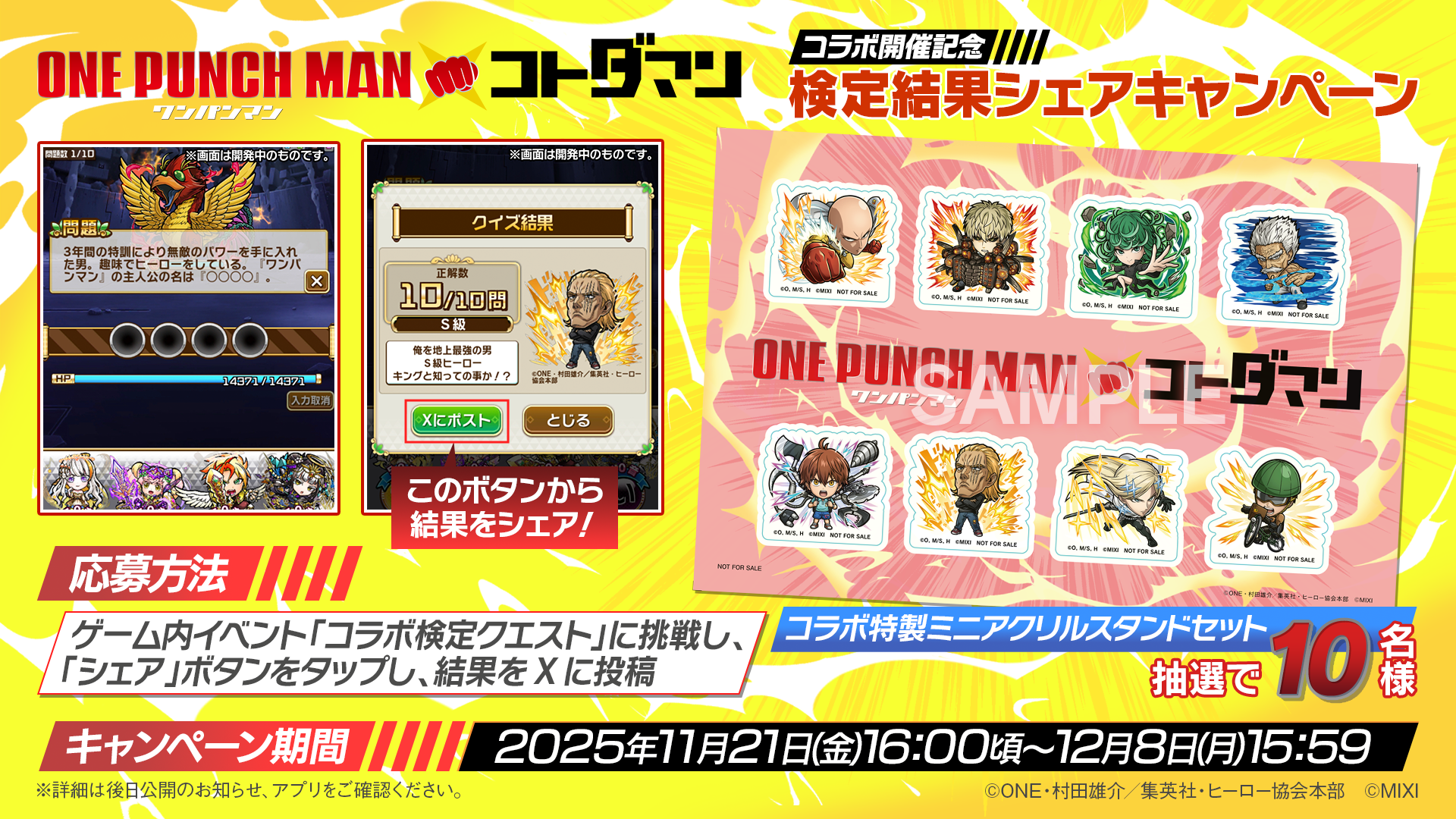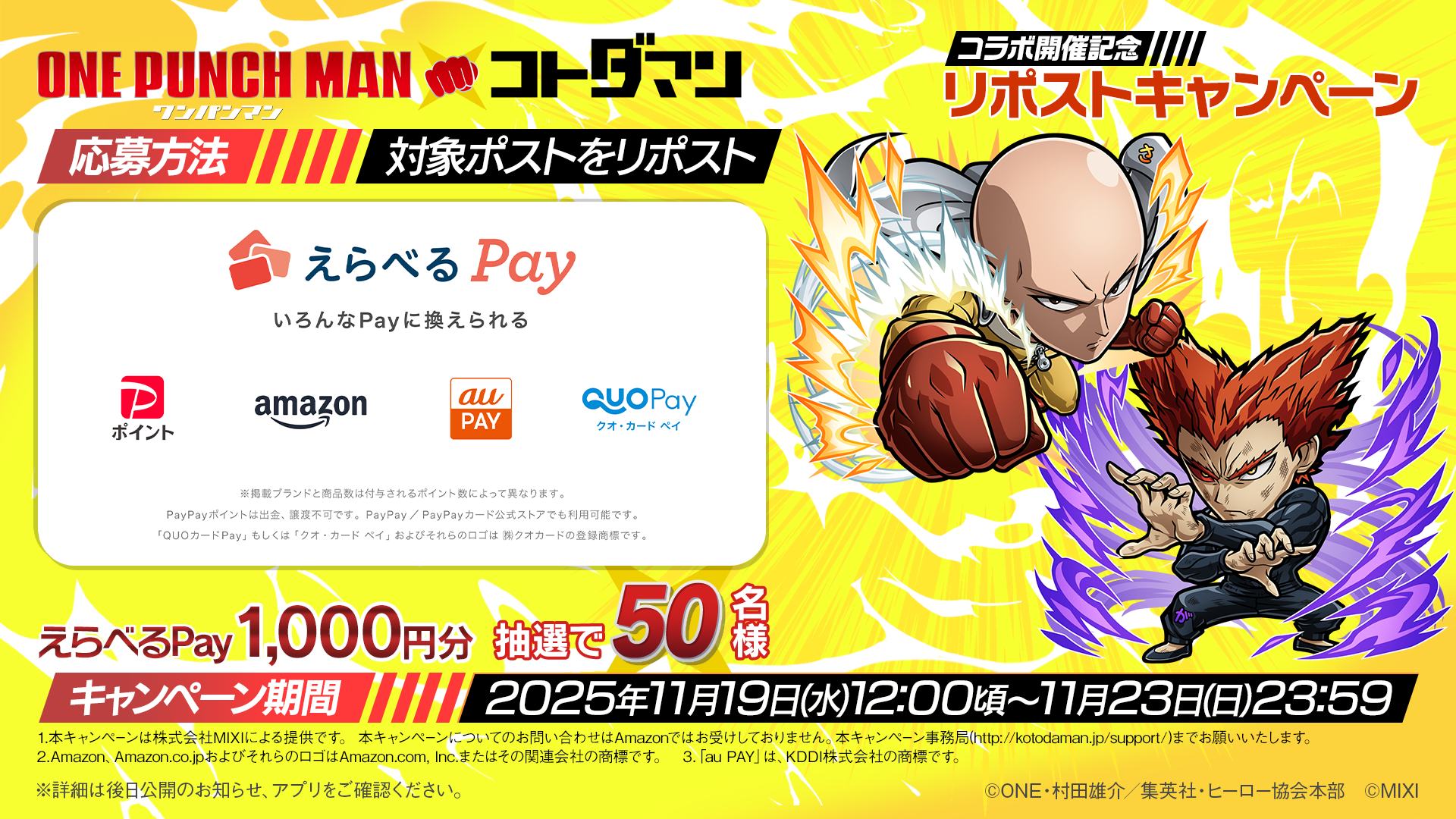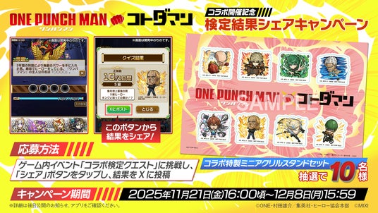 株式会社MIXI(東京都渋谷区、代表取締役社長 上級執行役員 CEO:木村 弘毅)は、スマホアプリの「ことば」で闘う新感覚RPG「共闘ことばRPG コトダマン」(以下コトダマン)において、アニメ「ワンパンマン」とのコラボを、本年11月21日(金)より開催します。