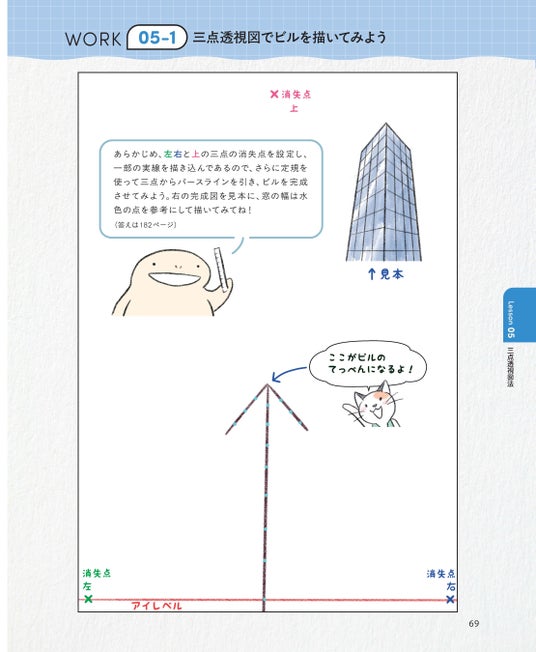 まず「パースとは何か?」という基本からスタート。アイレベル(目線の高さ)や透視図法の種類(一点・二点・三点透視)を、箱や部屋の描写などを通じて理解していきます。自分で描いてみることで、徐々にパース感覚を身につけていきましょう。