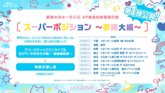 また、夢限大みゅーたいぷ「ゆめみたのあゆみ」Blu-ray購入者を対象とした「アコースティックミニライブ優先エリア観覧&広がれ!ゆめみたの輪!~動画撮影編~」と「特典お渡し会」も実施します。