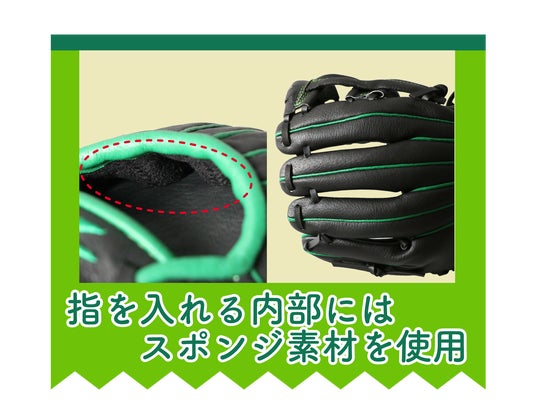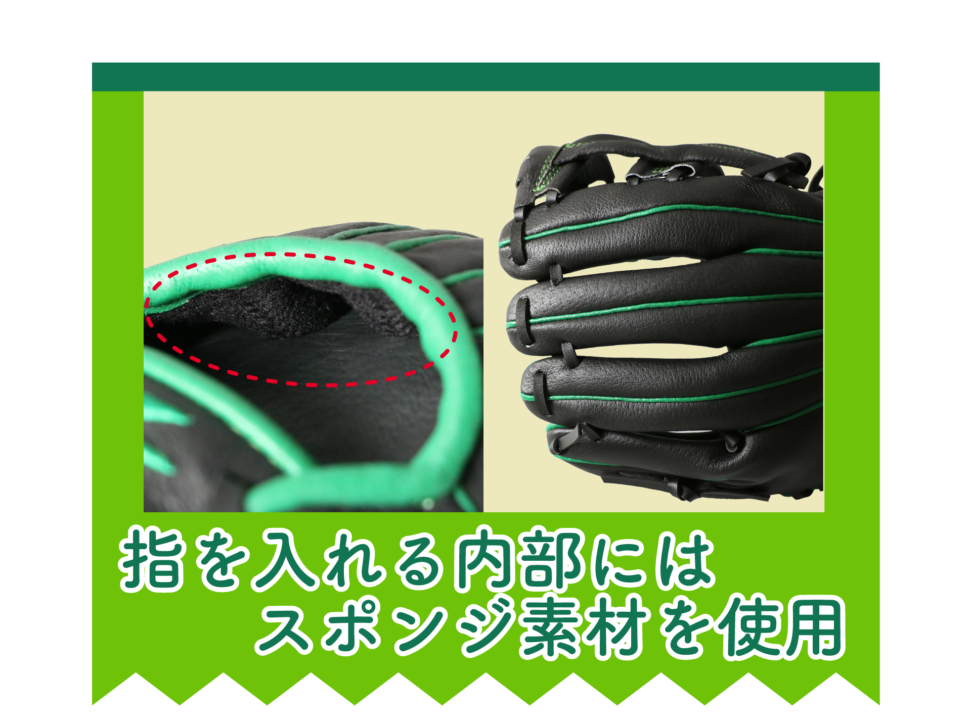 通常は革を使用するため硬く感じてしまう内部の指袋部分を、スポンジ素材に切り替えることで、グラブをはめた際の心地良さとフィット感が格段にアップしました。
