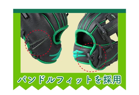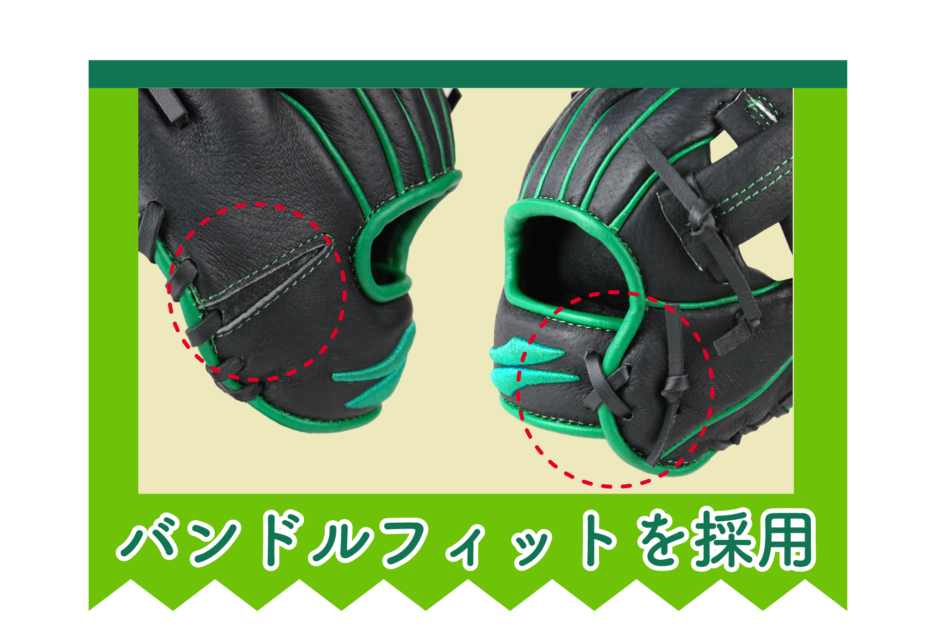 手の甲に当たるバンド部分に、通常のグラブとは異なる形の“バンドルフィット”を採用しています。手の甲から親指側にバンドが入り込んでいることで、手の小さい子ども達でも捕球する動きでよりバンドが手にフィットします!さらに小指側にはスリットラインと呼ばれる切り込みが入っており、小指側の動きもよりスムーズになります。