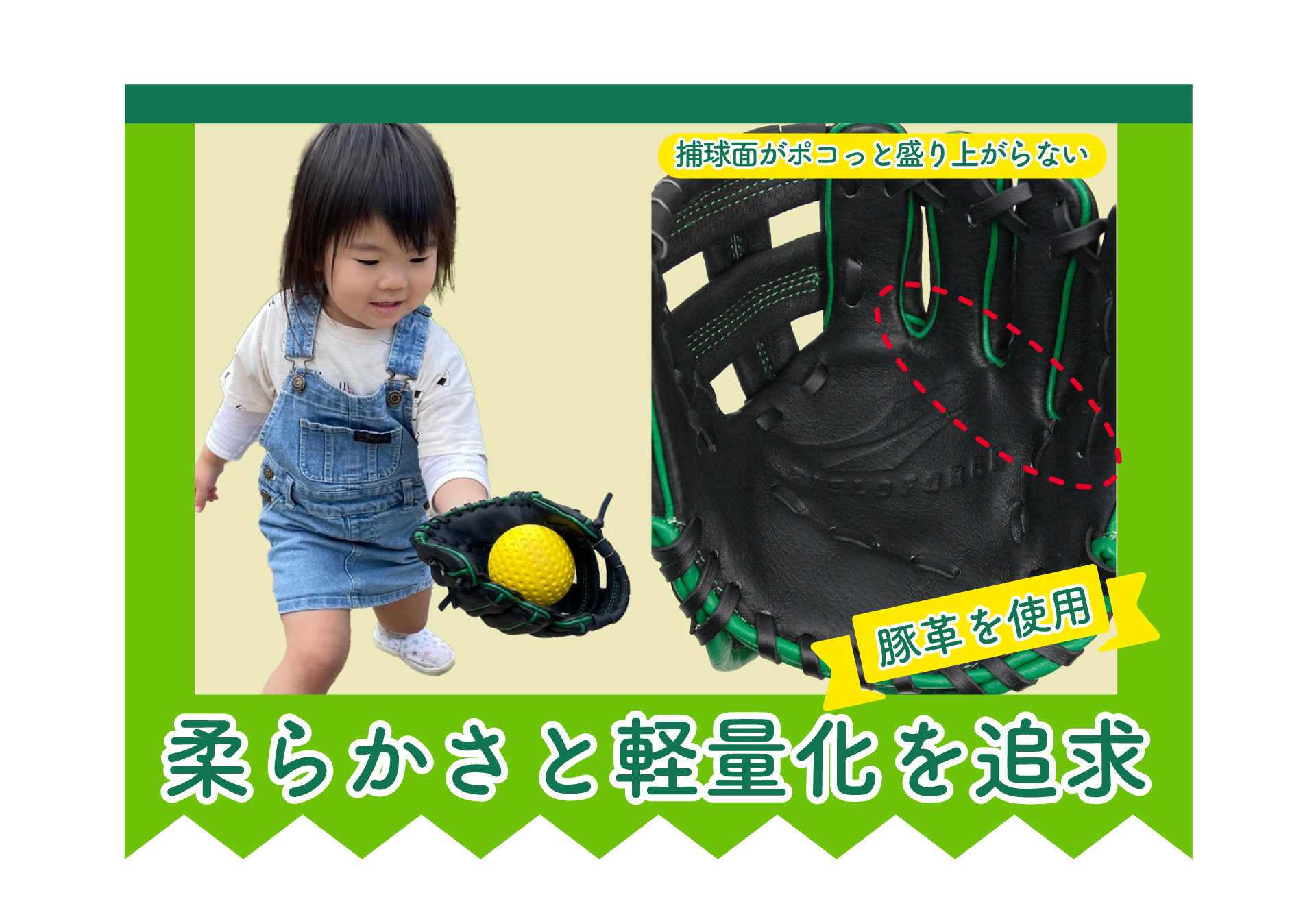 力のない子ども達でも操作しやすいように素材・仕様に工夫を凝らし、柔らかさと軽量化を追求しました。天然皮革の中でも、牛革よりも柔らかくてしっとりとしている“豚革”を使用し、厚みや内部の素材まで『子ども達が握れる柔らかさ』を追求しました。