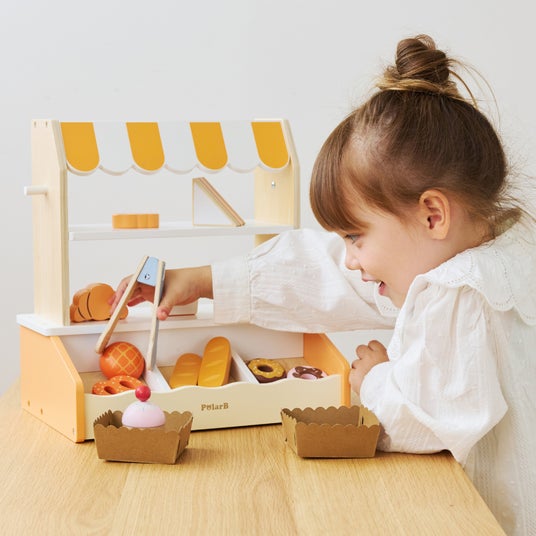 パンやスイーツがたっぷり14個付いた、パンやさんのおもちゃ。日本オリジナルのアイデアとして、お馴染みのメロンパンや食パンなども含まれており、より身近なごっこ遊びが楽しめます。オーブンでパンを焼いて、トングを使ってお店に並べて、バスケットに入れたら「はいどうぞ!」お友だちや家族と一緒に遊ぶことでコミュニケーションが広がります。