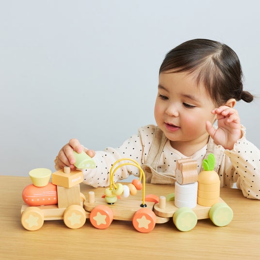 13個のブロック付きの、電車ごっこ・ルーピング・スタッキングが楽しめるおもちゃ。狙いを定めて積み木を棒にさす手と目の協応や、電車を動かすための腕や身体の使い方など、様々な知育要素が詰まっています。