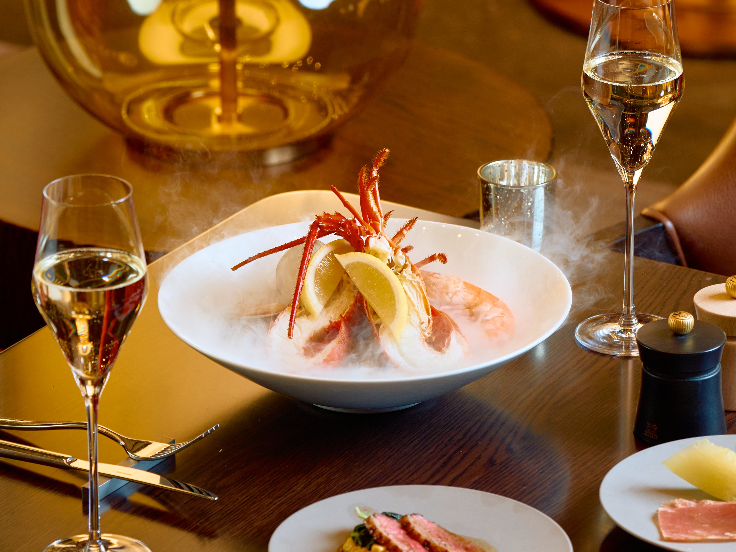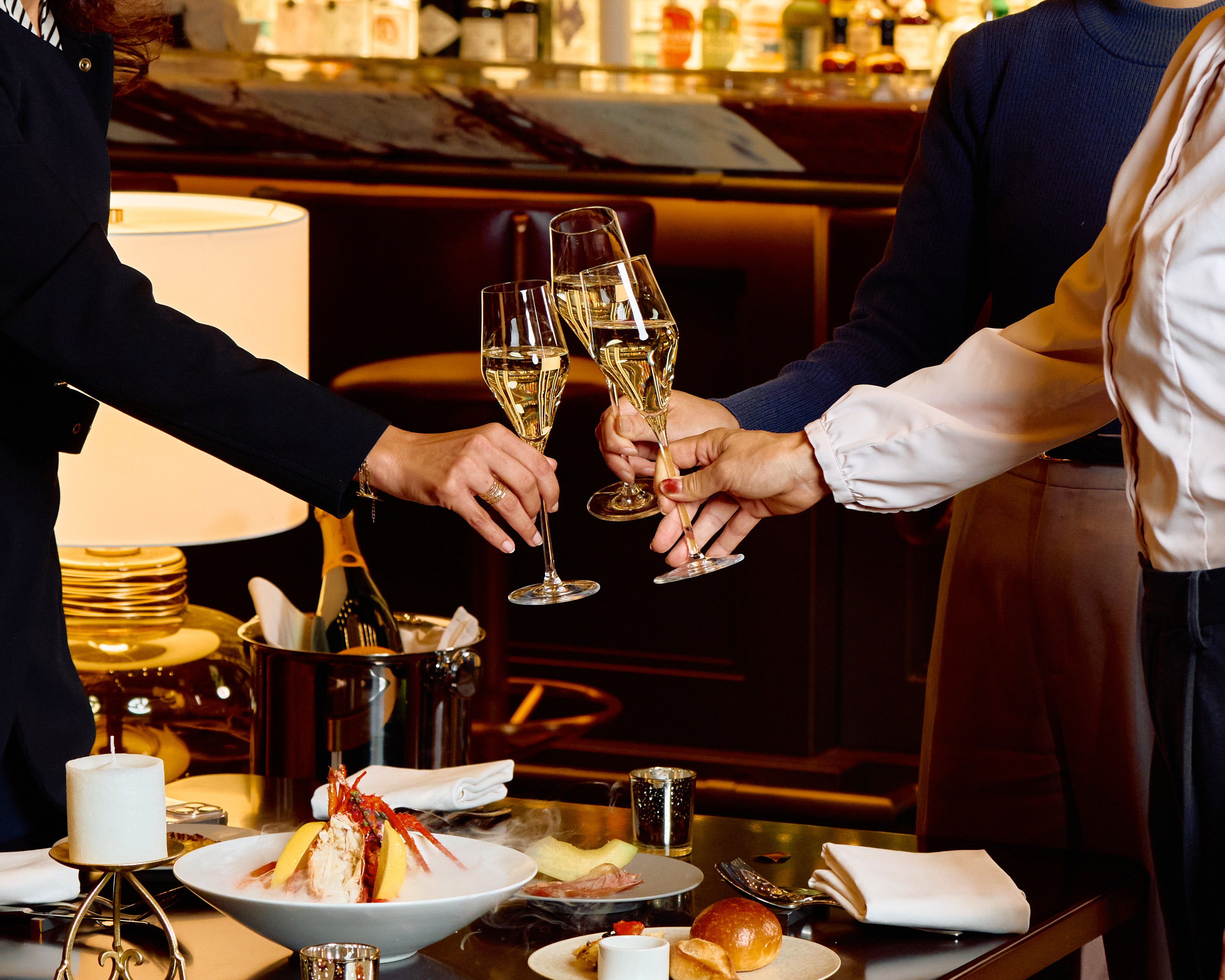 隣接するCrossroads Kitchenのライブキッチンへのアクセス付きのプランです。シャンデリアが煌めくラウンジ空間で、Crossroads Kitchenの出来立てのお料理と前菜のシーフードプラッターをお楽しみいただけます。(ドリンク別)
