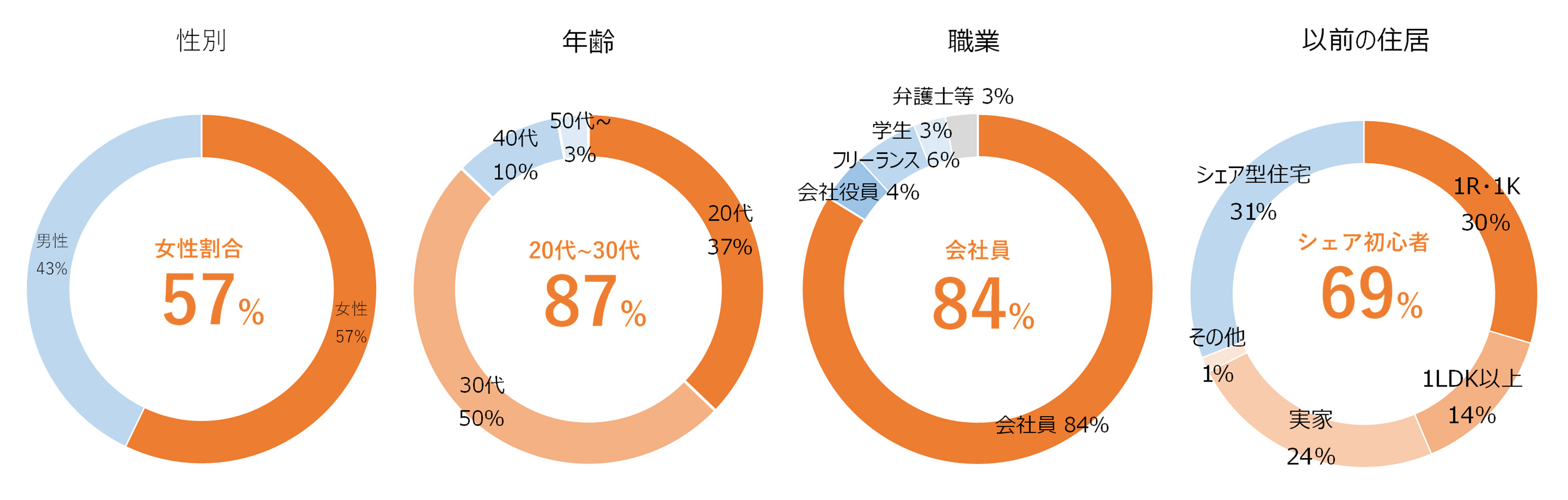 また入居者様全体の8 割以上が会社員、内約7 割が上場企業や大手外資系企業に勤務されています。従来の賃貸住宅ではなく、あえて「コリビング賃貸レジデンス」を選び、次世代のライフスタイルを実践する点も大きな特徴です。