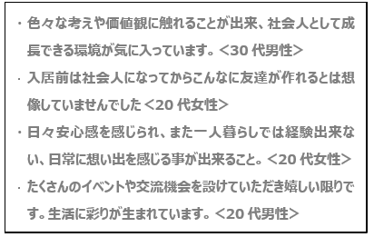 20~30 代の単身世帯を中心に、これまでの賃貸住宅やシェアハウスでは実現できなかった「ひとり暮らし」の新たな価値を、当社の不動産開発力とコワーキング運営で培ったコミュニティ運営力を活かして提供してまいります。