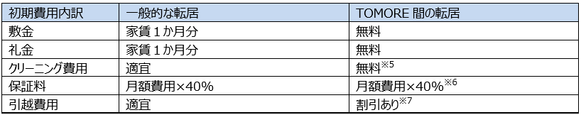 ※5:TOMOREに新規入居の場合、通常は退去時のクリーニング費66,000円が発生します。(家具付住戸の場合81,400円)