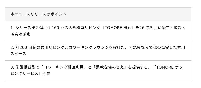 野村不動産株式会社(本社:東京都港区/代表取締役社長:松尾大作、以下「当社」)は、2025 年2 月に竣工した「TOMORE 品川中延(東京都品川区)」に続く、コリビング賃貸レジデンス※1 第2 弾として、利便性の高い山手線沿線に、総戸数160 戸の大規模物件「TOMORE 田端」(本物件)を新たに発表いたします。