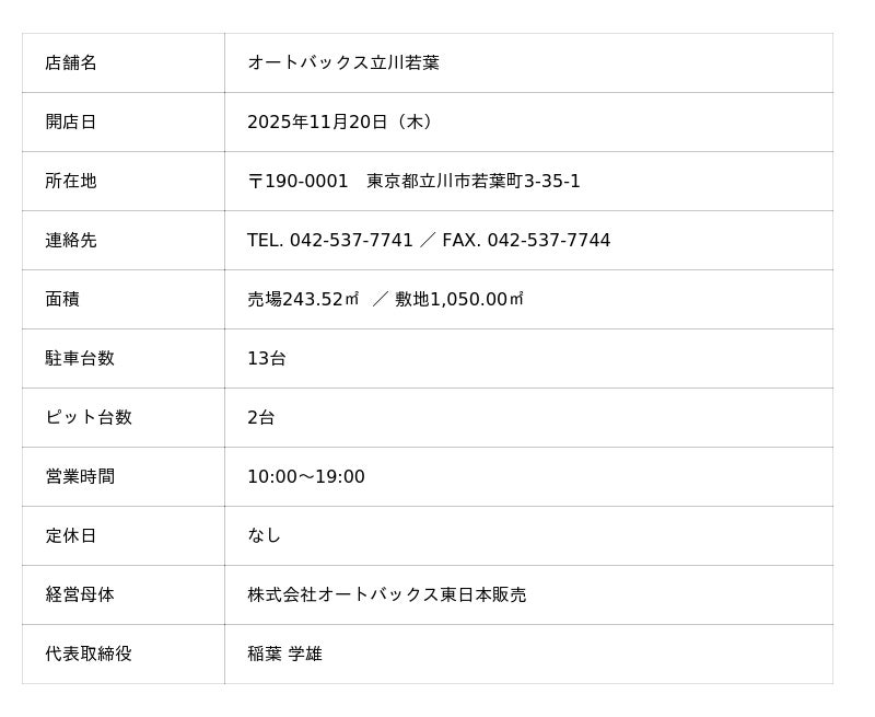 株式会社オートバックスセブン(代表取締役 社長:堀井勇吾)と加盟店契約を結んでいる株式会社オートバックス東日本販売(代表取締役:稲葉学雄)は、2025年11月20日(木)に「オートバックス立川若葉(たちかわわかば)」を新規オープンいたします。
