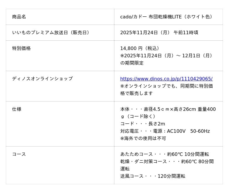 株式会社dinos(本社:東京都中野区、代表取締役社長:加藤 浩輔)は、ワンタッチで布団乾燥ができる「cado/カドー 布団乾燥機LITE」のディノス限定ホワイトカラーを、2025年11月24日(月)放送のフジテレビ番組『ノンストップ!』の通販コーナー『いいものプレミアム』で販売します。(通販コーナーURL https://www.dinos.co.jp/tv/premium_s/)