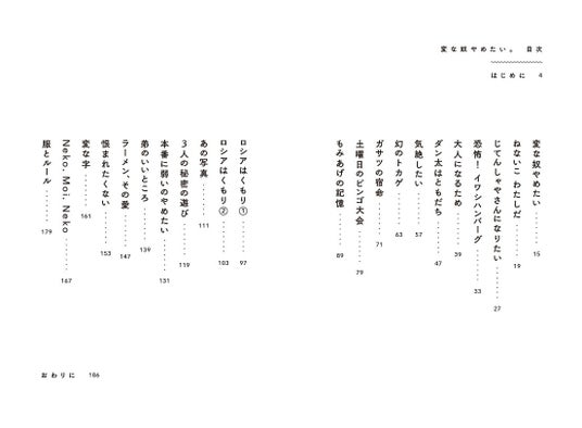”変な奴”になったルーツを語る「変な奴やめたい」。戦隊ヒーローに憧れ、ことあるごとに気絶を試みる「気絶したい」。大事なところでどうしても失敗してしまう自分を書いた「本番に弱いにやめたい」。自分は大事な思い出としてずっと覚えているのに、友人はそのことをすっかり忘れている悲しさを書いた「3人の秘密の遊び」。飼い猫への信頼と愛情が詰め込まれ、涙なしでは読めない「Neko, Moi, Neko」。”変な奴”である自分を受けいれた「服とルール」……。