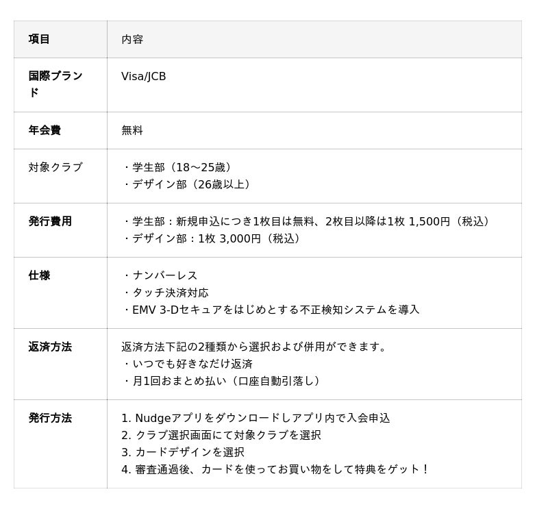 26歳以上の方は「デザイン部」を選択することで、発行料3,000円(税込)にてお申し込みいただけます。学生部で人気を博したカードデザインを引き続き利用できるほか、限定デザインの展開も予定しています。ナッジカードとは