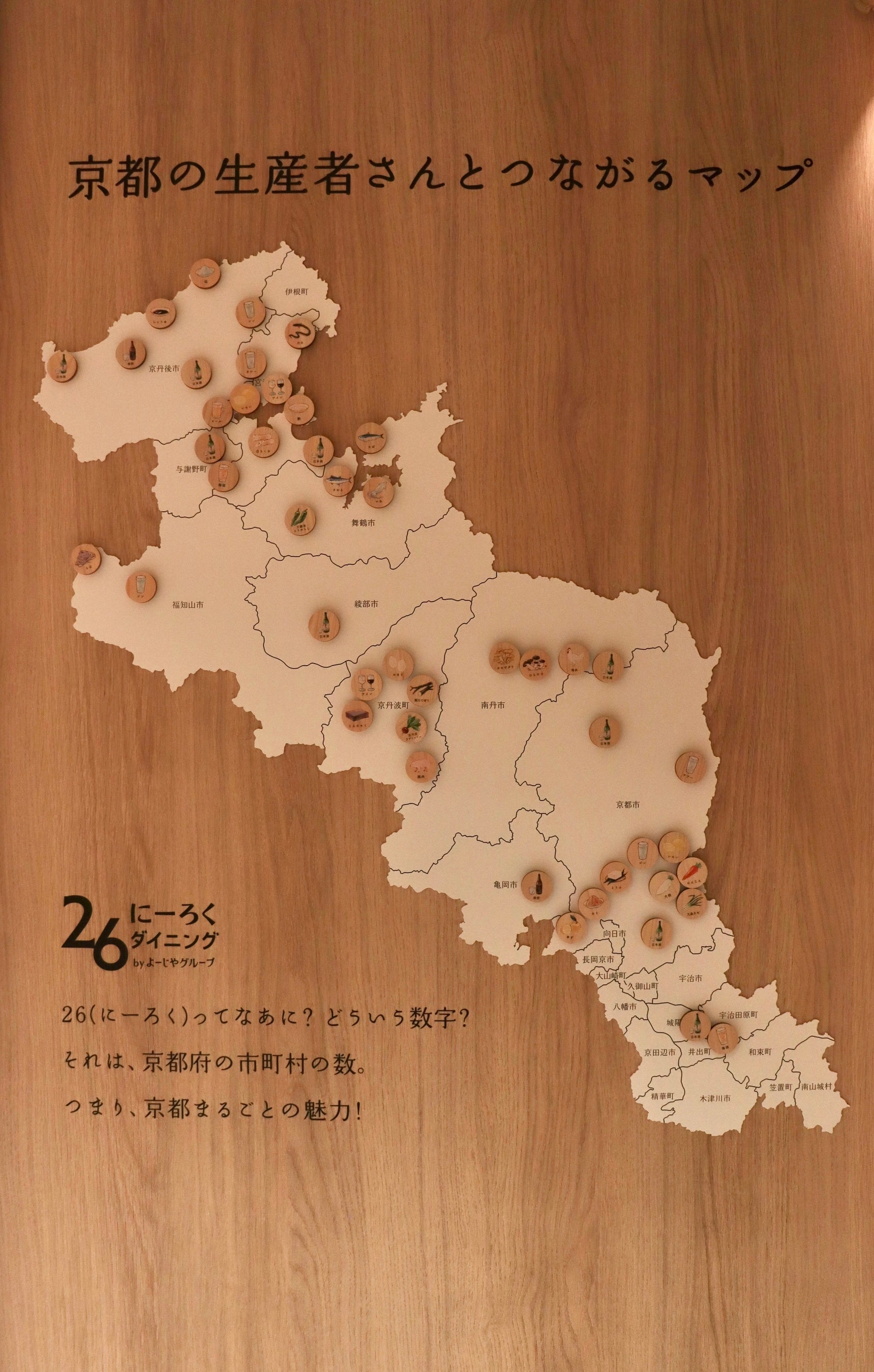 よーじやグループの新業態「26(にーろく)ダイニング」は、京都府の26市町村をめぐり集めた食材を提供、その生産者さんとつながるお店です。26市町村には、まだ世に知られていない、山の恵み、海の恵み、里の恵みがたくさんあります。また、その背景には、仕事に妥協のない生産者さんや、その食材が生まれるまでの物語があります。「26(にーろく)ダイニング」では、生産者さんの思いを引き継いで、シンプルでていねいな料理や、料理がさらにおいしくなる情報を提供します。そして、京都のひとが京都を誇りに思い、京都に訪れた友人を案内したくなる店舗を目指します。1号店としてオープンするCOCON KARASUMAは、京都最大のビジネス街の四条烏丸エリアに位置する、ショップやレストラン、映画館、上層階にはオフィスを備えた複合商業施設です。その地下1階に出店する「26(にーろく)ダイニング」の店内は、木調ベースで自然な温かみがある、リラックスできる空間を演出しています。さらに、入り口付近の壁には「生産者さんとつながるマップ」を掲示しており、その日提供する食材と、生産地の風土まで感じることができます。さらに、お席にある「生産者さんとつながるブックレット」では、食材へのこだわりや、ものづくり、地域への思いを深く知ることができます。食材の向こう側にある背景を知ることで、食べる喜びはさらに豊かになり、食材も料理も、そして生産者さんもさらなる輝きを放つと信じています。だからこそ、生産者さんより受け取った熱意を「26(にーろく)ダイニング」を通して、お客さまにしっかりと伝えていきます。