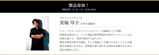 また、ドバイ不動産の購入を検討中の箕輪氏に向けて、アペックスキャピタルが物件をご提案するプレゼン企画も予定。これまでにないコラボ企画となりますので、今後の配信をぜひご期待ください。