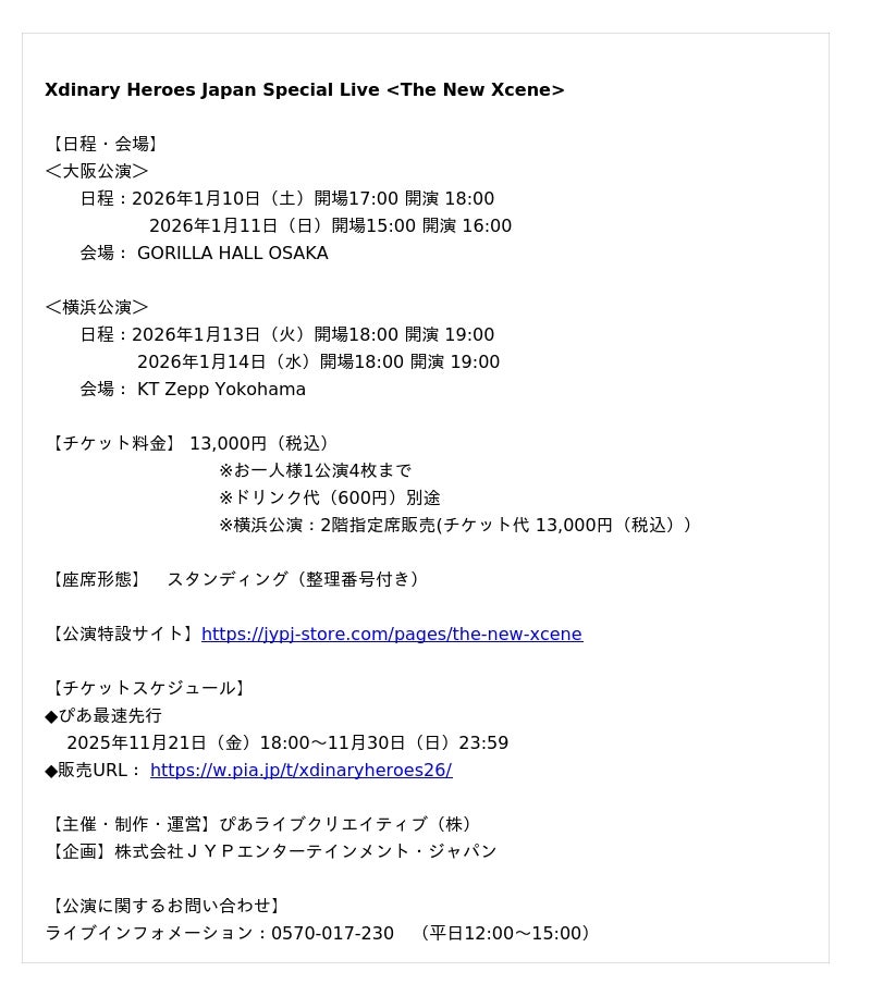 TWICEやStray Kidsが所属するJYPエンターテインメントから、2021年に颯爽とデビューした韓国発のボーイバンド・Xdinary Heroes(エクスディナリーヒーローズ)が、日本初単独ライブ「Xdinary Heroes Japan Special Live <The New Xcene>」を開催する。公演は2026年1月10日(土)・11日(日)に大阪・GORILLA HALL OSAKA、1月13日(火)・14日(水)に横浜・KT Zepp Yokohamaで行われる。