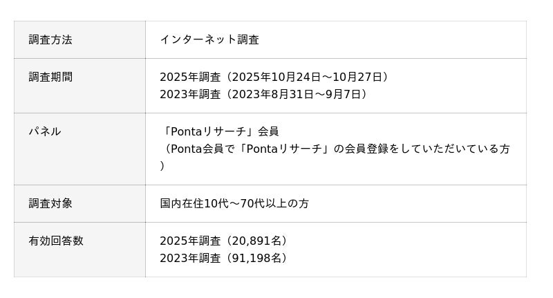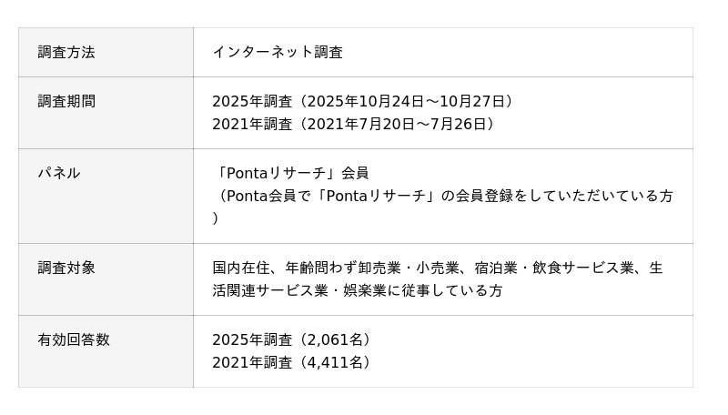 生活者に対しては10代から70代以上の方20,891名を対象に、2025年10月24日~10月27日に調査を行いました。事業者に対しては卸売業・小売業、宿泊業・飲食サービス業、生活関連サービス業・娯楽業に従事している2,061名を対象に2025年10月24日~10月27日に調査を行いました。