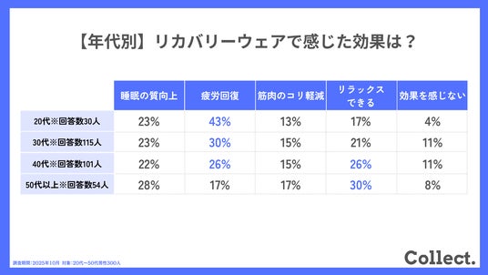 - 20代では43%が「疲労回復」の効果を感じる一方、50代以上は「リラックスできる」(30%)が最多