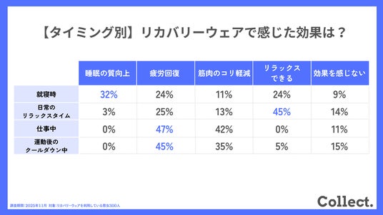 近年、就寝中や日常のリラックスタイムに着用する「リカバリーウェア」が注目を集めています。そこでCollect.(コレクト)では、リカバリーウェア利用者300人を対象に、「本当に効果があるのか」「どの年代・どんなシーンでどのような効果が実感されているのか」を調査しました。