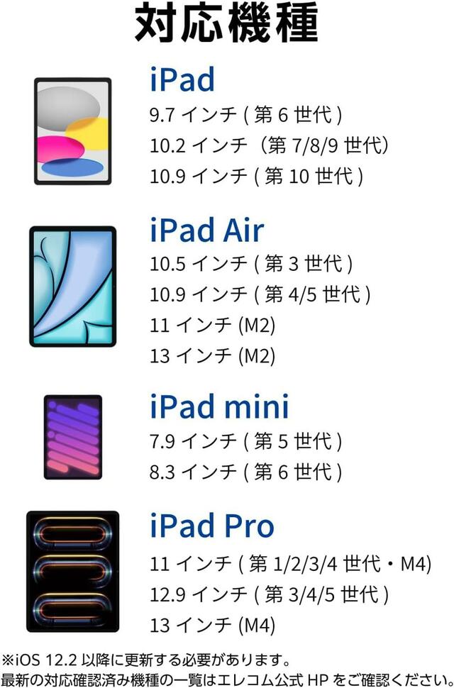 対応端末の広さも魅力のひとつで、2018年以降に発売された幅広いiPadモデルに対応。iPad、iPad Air、iPad Proの主要モデルをカバーしているため、複数のiPadを使い分けている人や、買い替えを予定している人でも安心して選べる1本です。