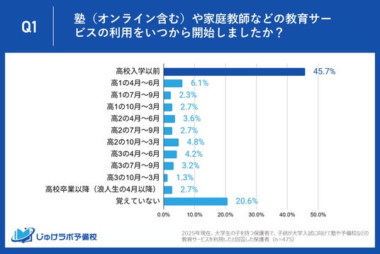 じゅけラボ予備校(所在地:大阪市北区、代表取締役:後藤智則)はこの度、大学入試で塾や予備校などの教育サービスを利用した大学生の保護者475名を対象に、教育サービスの利用開始時期と大学合格に関するアンケート調査を実施いたしました。