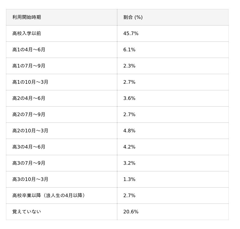 今回の調査で「塾や家庭教師などの教育サービスの利用をいつから開始しましたか?」と質問したところ、最も多かった回答は「高校入学以前」で、全体の45.7%を占めました。